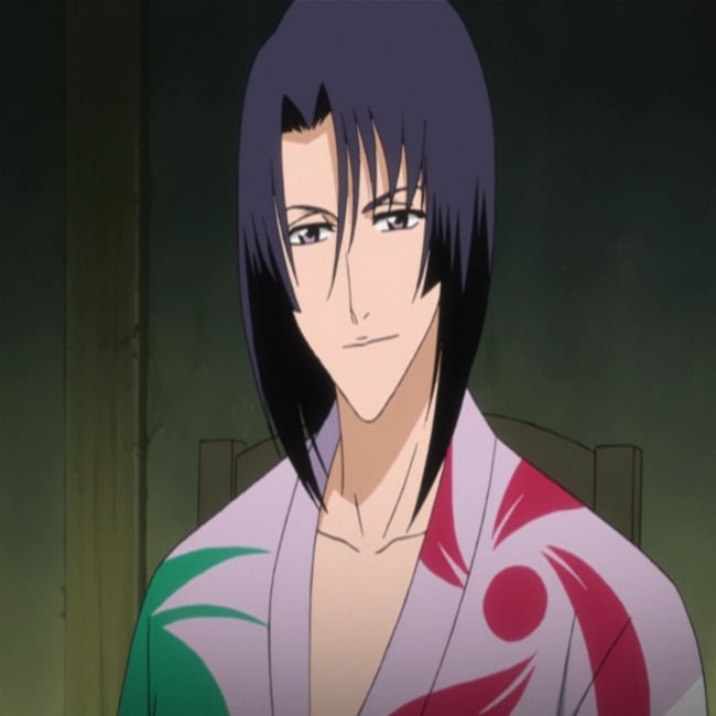 This is a photo of Ayasegawa Yumichika, a fictional character, the current and former five lieutenants of the 11th Division in the Bleach manga. Yumichika has colorful feathers on her right eyelash and eyebrow. He has shiny skin, purple eyes, and jaw-dropping black hair that, combined with feathers, gives him a somewhat feminine appearance.